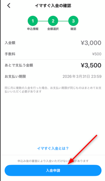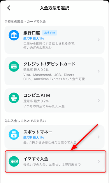入金方法で一番下の「イマすぐ入金」をタップすると、イマすぐ入金の案内画面に進みます。