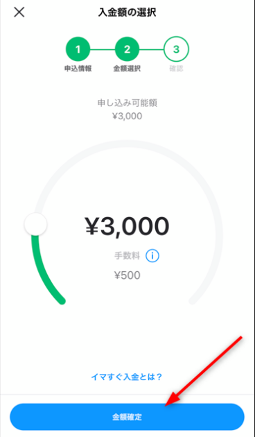 続いて入金額の設定画面になります。中心の数字の周辺にあるスライダーを動かし、入金額を決めたら「金額確定」をタップします。