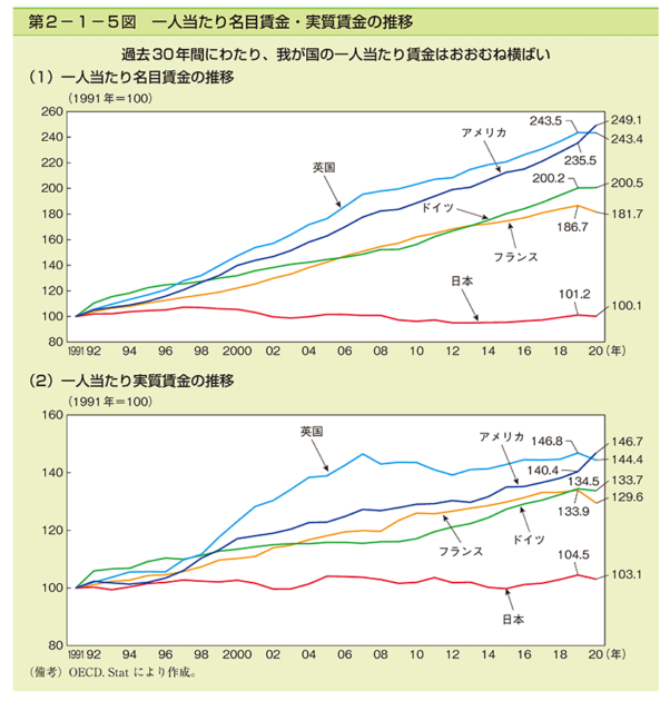 日本は先進国において、直近約30年間で唯一経済成長できていません。実質賃金の推移と金銭的な生活の充実度からも明らかです。