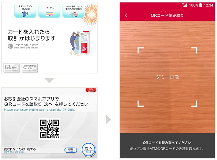 これらをセブン銀行ATMの前で行ったあと、セブン銀行ATMの操作パネルの「スマートフォンでの取引」をタップしましょう。