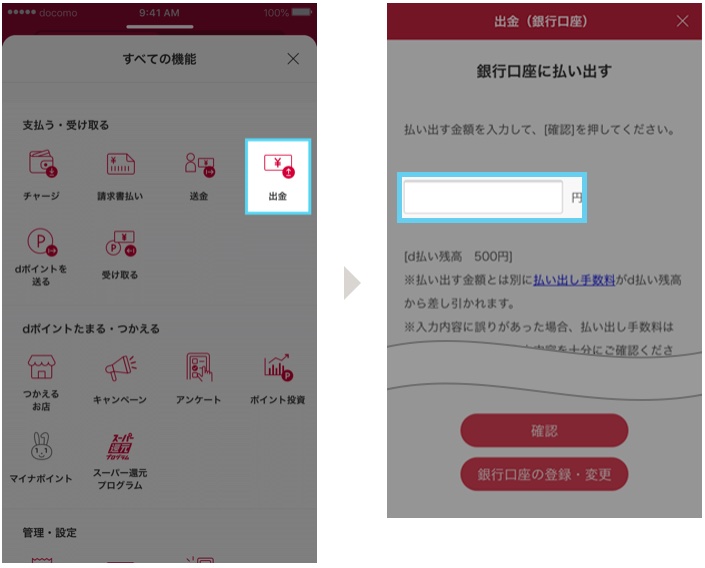 まずd払いアプリのホーム画面で「出金」をタップします。次に、出金金額を入力して、「確認」をタップしましょう。
